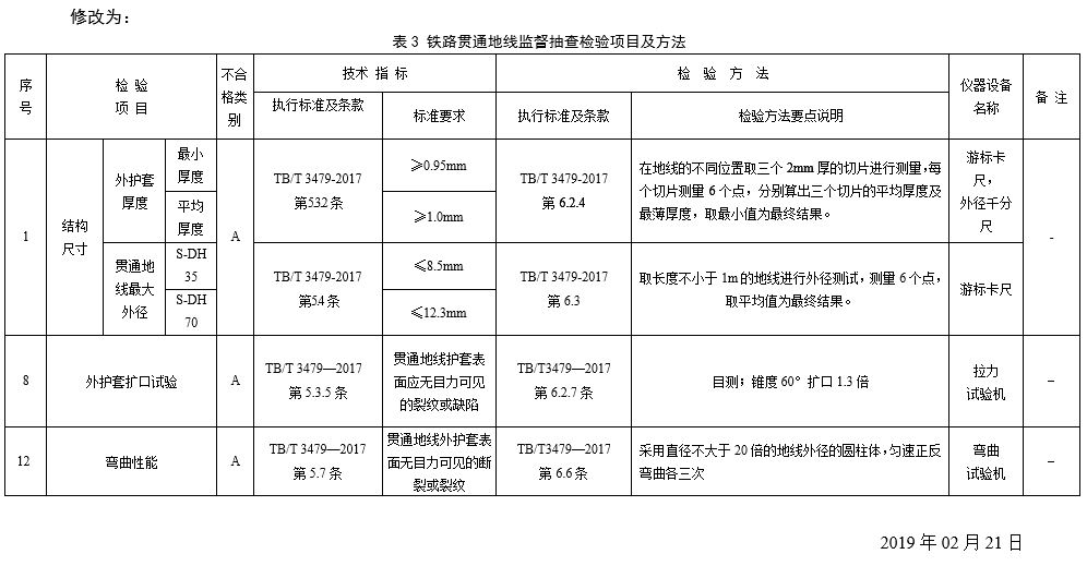 《铁路贯通地线-铁路专用产品质量监督抽查检验实施细则》(GTCC-001-2018)更正内容