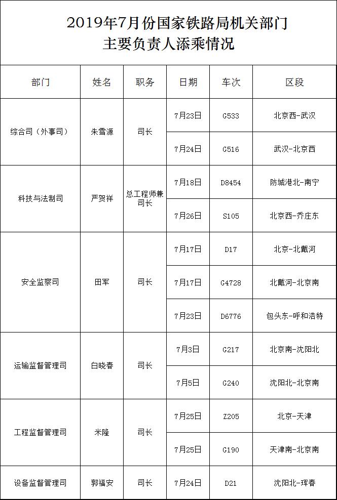 下一篇:2019年7月份国家铁路局机关部门主要负责人添乘情况