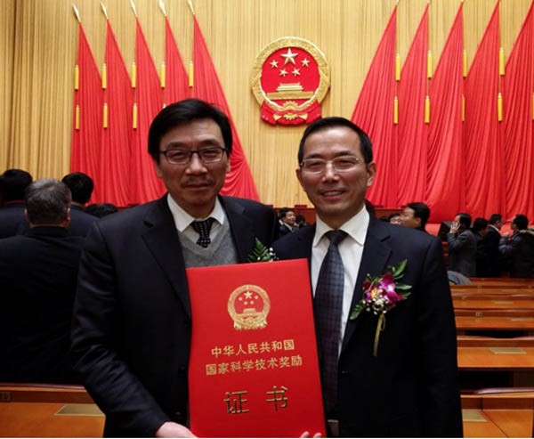 1月10日,国家科学技术奖励大会在北京隆重举行。图为铁路行业获得国家科技进步一等奖项目的第一完成人高宗余(右)与获得国家科技进步二等奖项目的第一完成人高仕斌现场合影。