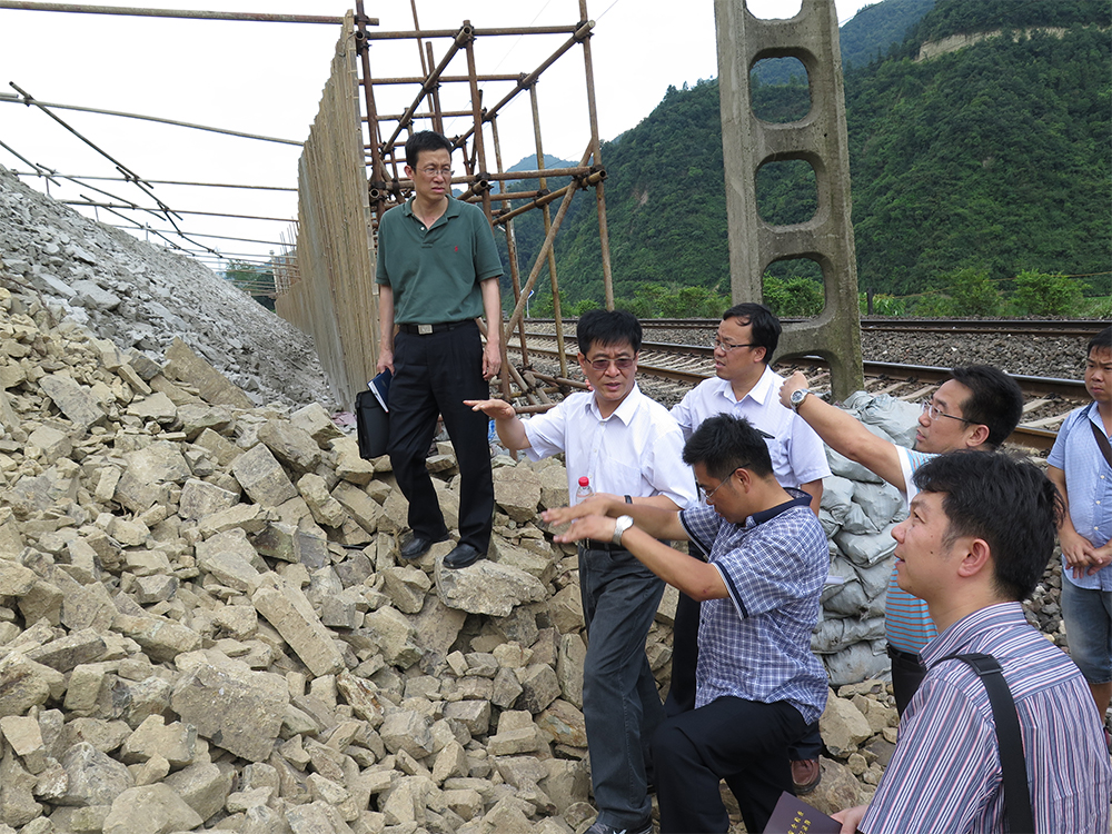 7月份以来,国家安全生产监督管理总局和国家铁路局联合开展铁路防洪督导检查。图为国家安全生产监督管理总局安全监督管理二司副司长赵瑞华(左二)等人现场检查、分析沪昆线K1698+450山体滑坡原因。