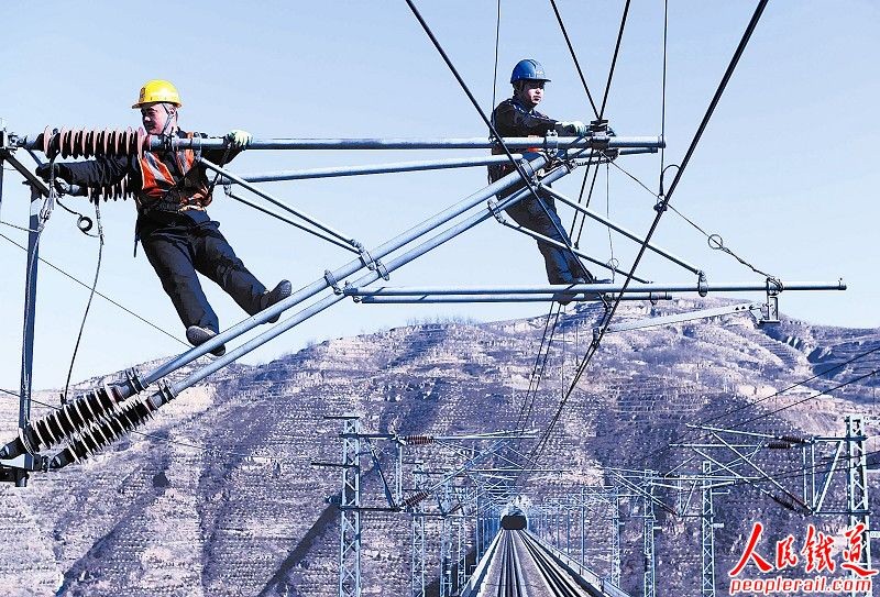 图为太原铁路局太原供电段吕梁车间职工在检修供电设备。温希伟 摄