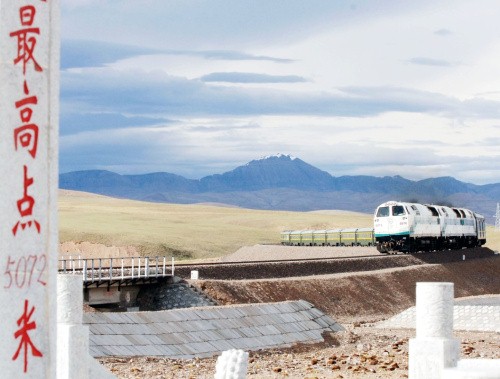 从格尔木发出的“青1”次列车顺利通过海拔5072米的世界铁路最高点——唐古拉山口。新华社记者 格桑达瓦 摄