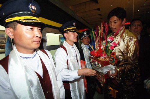 2006年7月2日零时31分,首趟进藏的“青1”次列车安全抵达拉萨站。藏族群众向列车工作人员敬献“切玛”。 新华社记者 巩志宏 摄
