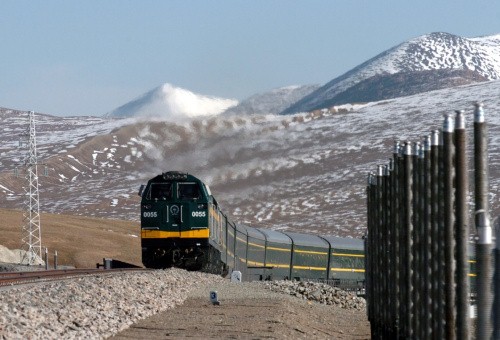 一列进藏列车经过昆仑山冻土热棒试验区。青藏铁路建设工程采取热棒、碎石护坡等多种技术措施有效?;ち搜叵叨惩粱肪场?新华社记者 侯德强 摄