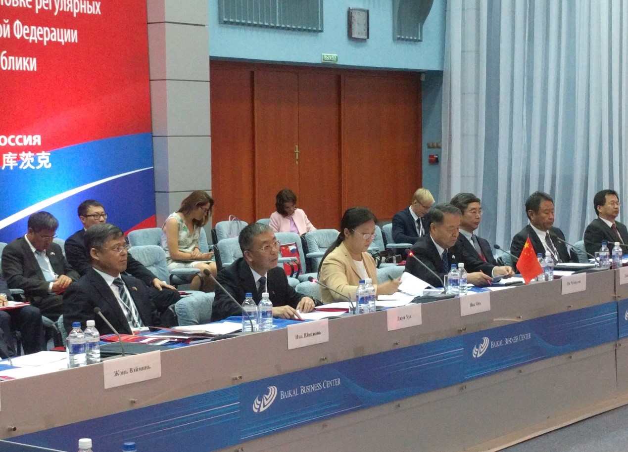 8月5日,局党组成员钟华(左二)出席在俄罗斯伊尔库茨克举行的中俄总理定期会晤委员会运输合作分委会第二十次会议?;嵋橛芍谢嗣窆埠凸煌ㄔ耸洳坎砍ぱ畲煤投砺匏沽钤耸洳坎砍に骺坡宸蚬餐鞒?,双方就交通运输领域推进丝绸之路经济带建设与欧亚经济联盟建设对接务实合作进行了深入磋商并达成广泛共识。