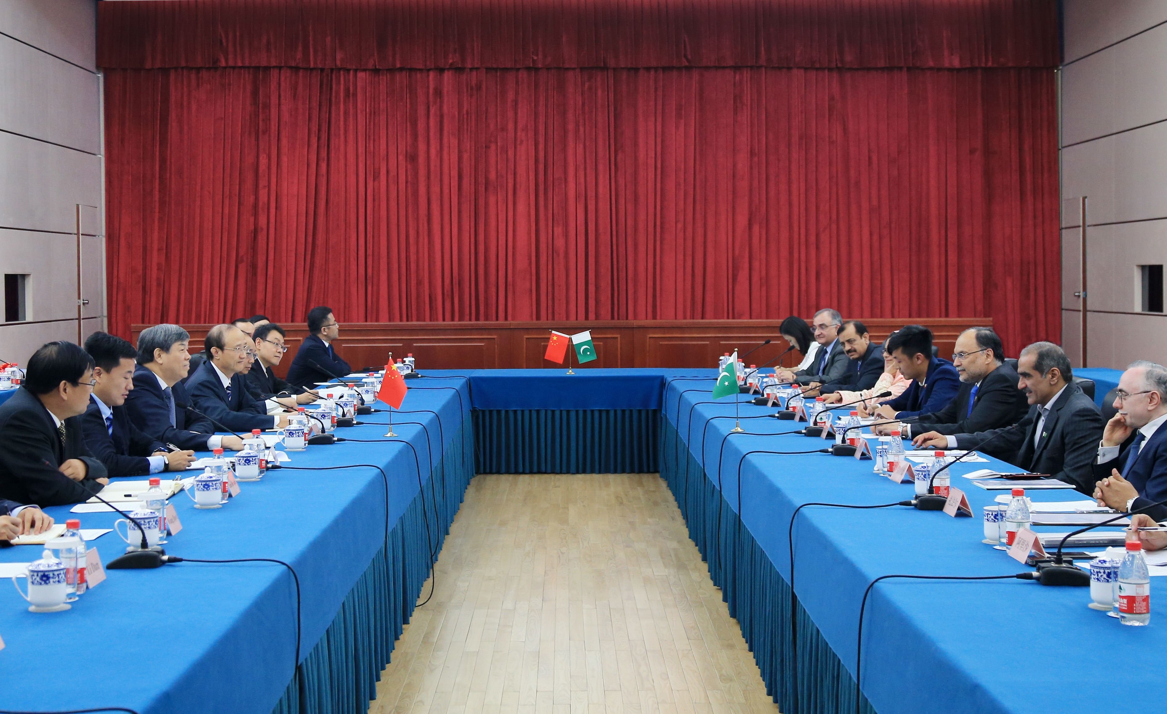 9月26日,国家铁路局局长陆东福与应邀来访的巴基斯坦计划发展部长伊克巴尔、铁道部长拉菲克共同主持召开中巴铁路合作部长级会议,就落实中巴两国领导人关于建设中巴经济走廊的战略共识,推动铁路合作项目实施有关问题及下一步工作计划进行了深入磋商。国家铁路局党组成员郑健及相关司局,国家发改委、进出口银行、中国中铁股份有限公司、铁二院、铁一院等中方有关部门和单位,以及巴基斯坦驻华大使、中巴经济走廊特使,巴基斯坦铁道部、巴基斯坦驻华使馆等巴方有关部门和单位参加了会议。图为陆东福(左三)与巴基斯坦计划发展部长伊克巴尔(右三)、铁道部长拉菲克(右二)共同主持召开中巴铁路合作部长级会议。