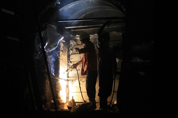 工人在高黎贡山隧道施工。