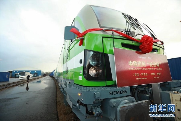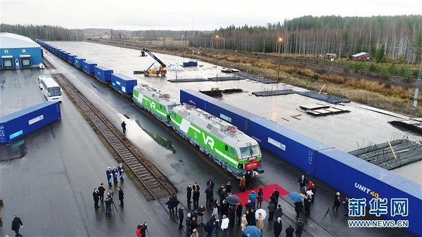 11月10日(芬兰当地时间),一班载有41个集装箱的国际铁路列车从芬兰铁路枢纽城市科沃拉驶向终点站西安港。这是中国与北欧国家之间的首趟中欧班列。该班列主要装载电梯配件等机电设备,还有食品、纸浆等商品,途经芬兰、俄罗斯、哈萨克斯坦,从霍尔果斯口岸入境中国,全程9000多公里,历时16到18天。图为在芬兰科沃拉,一班载有41个集装箱的国际铁路列车停在货运车站内等待发车。
