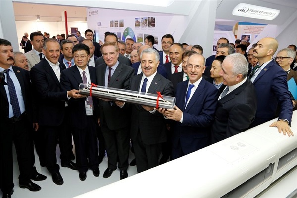 土耳其交通部长阿斯兰(前排右三)展示中国“复兴号”高铁列车模型。