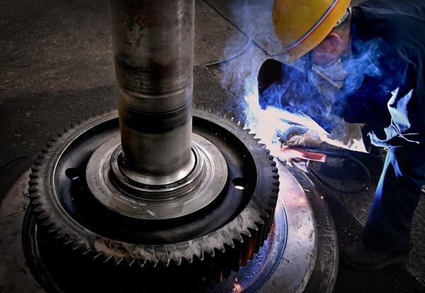 河南省郑州市的气温接近40摄氏度,郑州机务段机车检修库房内,火车头车轮“诊疗师”在挥汗如雨地作业。(图片来源:新华社)