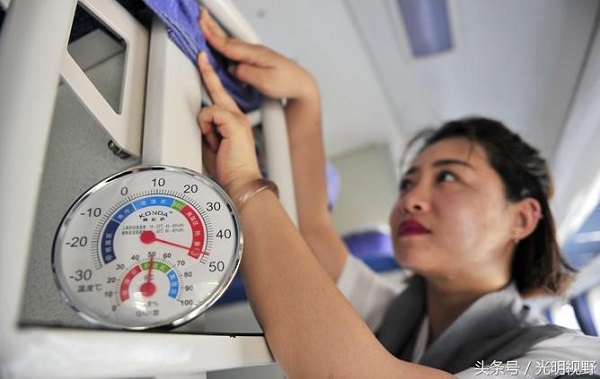 列车检修入库后关好门窗、断电,整备车厢内的气温达到46℃,在“桑拿房”一般的车厢内,呼和浩特铁路局包头客运段K89/90列车安全员托雅正在对卧铺车厢进行整理。(图片来源:光明网)