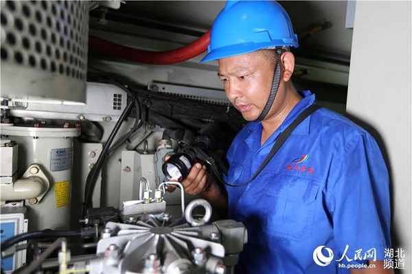 在襄阳机务段襄阳东整备场上,工作人员在机车内查看机车的制动系统,机械室温度超过50摄氏度,工人已汗湿衣衫。(图片来源:人民网)