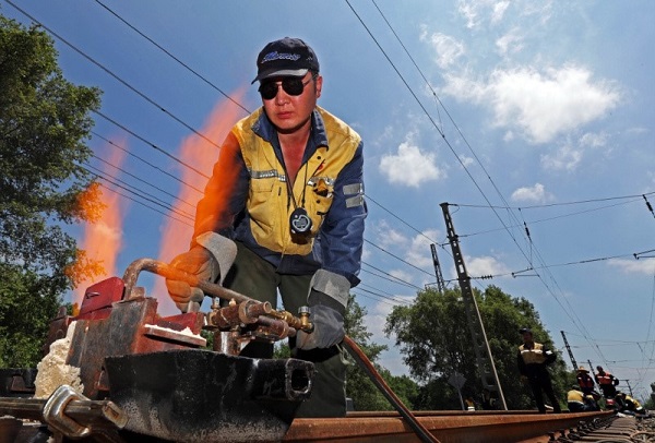 在沈阳裕国火车站,沈阳工务段开原综合维修车间焊轨工在高温下进行焊轨作业。(图片来源:新华社)