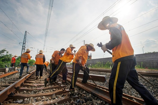 铁路工人顶着烈日在湖北荆门漳河站进行钢轨更换作业。(图片来源:新华社)