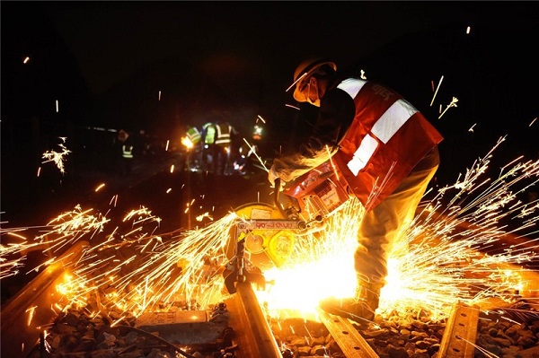 11月7日是立冬节气,贵州铁路部门针对气温降低的情况,对铁道线路、信号设备等进行全面“体检”,确保冬季列车运行安全。图为贵阳工务段职工在渝贵铁路线更换重伤钢轨。