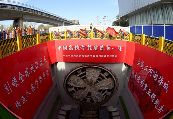 11月20日,由中铁十四局集团负责施工的京张高铁清华园隧道顺利贯通。清华园隧道是目前北京市内最大直径的盾构隧道,为京张高铁的控制性工程,开挖直径12.64米,全长6.02公里。它的贯通为2019年底京张高铁全线通车创造了有利条件。图为“天佑号”盾构机刀盘从京张高铁清华园隧道洞内顶出。