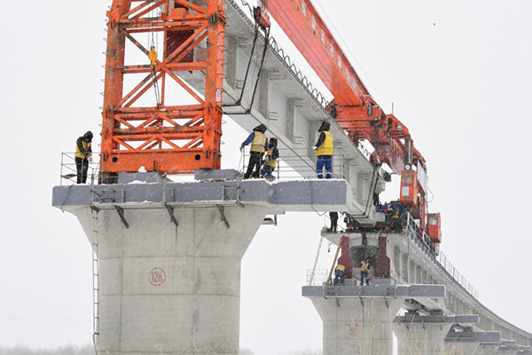 12月18日,在川藏铁路拉林段工地,建设者顶风冒雪在贡嘎雅鲁藏布江特大桥上进行铺轨架梁作业。川藏铁路拉萨到林芝段是西藏第一条电气化铁路,正线全长435.48公里,设计时速160公里,预计2021年建成通车。