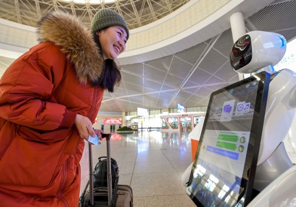 旅客在呼和浩特火车东站与智能机器人交流。(来源:新华社)