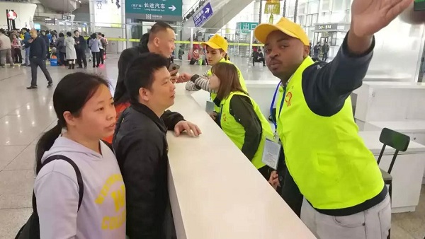 外籍青年志愿者在广州南站服务旅客。(来源:人民铁道网)
