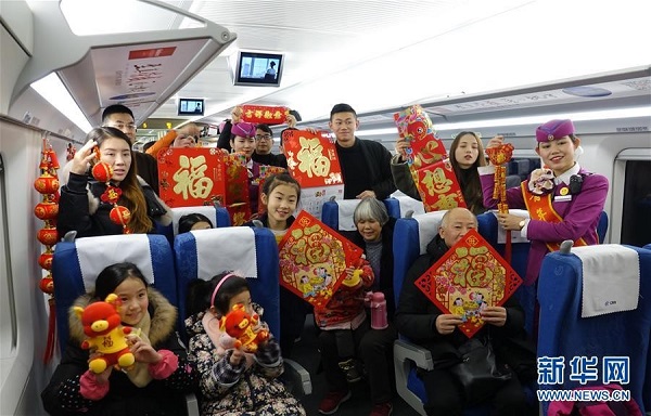 在贵阳北开往宁波的G2334列车上,乘务员为旅客送上春联、福字挂历和生肖猪玩偶等新年礼品。(来源:新华社)