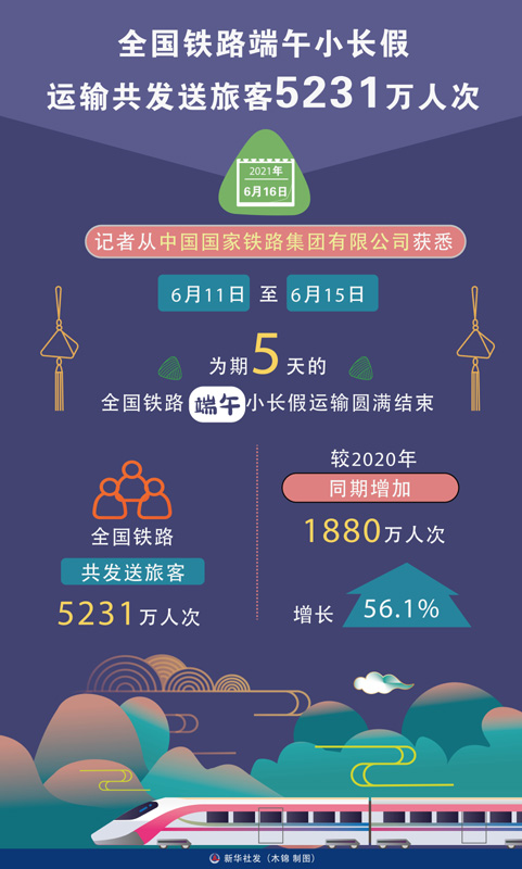 6月11日至6月15日,为期5天的全国铁路端午小长假运输圆满结束,全国铁路共发送旅客5231万人次,较2020年同期增加1880万人次、增长56.1%。