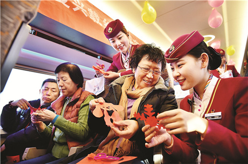 乘务员在车厢内开展特色主题活动。