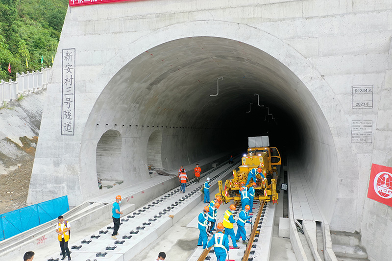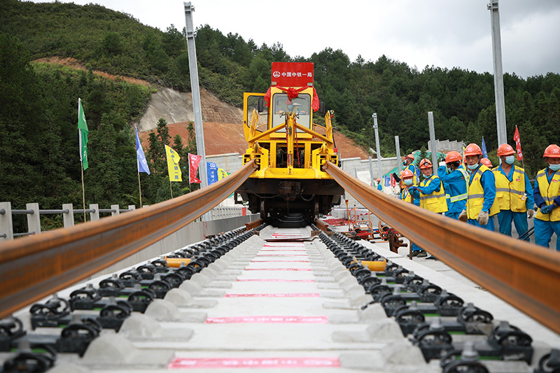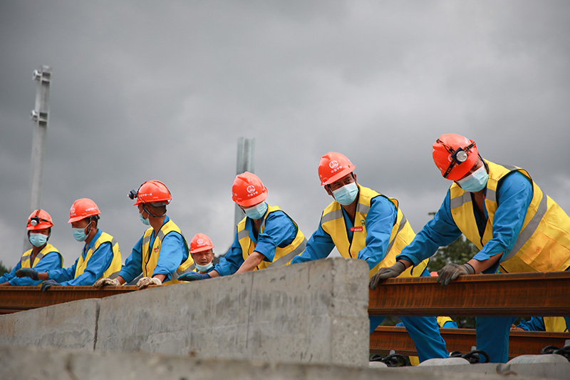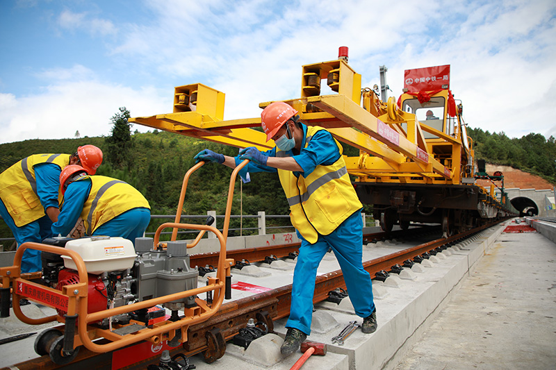 图为建设者们在进行铺轨施工。