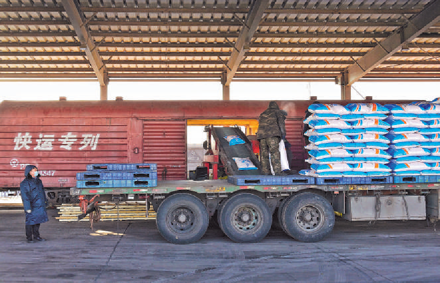 哈尔滨车务段为保障春耕物资运输畅通,合理制订卸车计划,安排有效货位组织化肥装运??到?摄