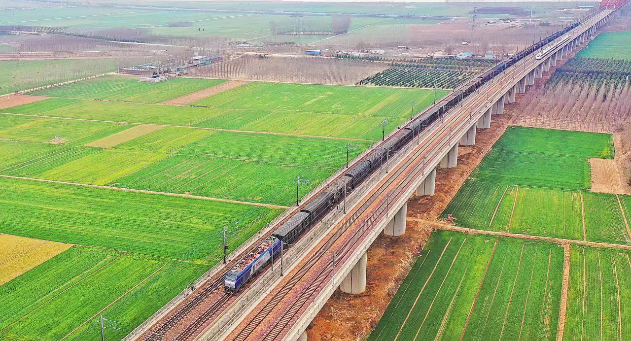 一列装载春耕物资的货物列车快速驶过河南武陟黄河滩小麦产区。王玮 摄