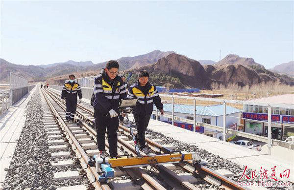 近日,锡林浩特综合维修段职工在检查钢轨几何尺寸。 杨庆臣 摄