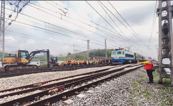 衡阳工务段、娄底工务段联合施工队,在瓦园站使用数台小型机械开展换砟作业。徐 媛 摄