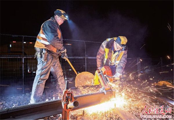 近日,宜昌综合维修段打磨专班职工在焦柳线下行枝城站站内进行钢轨打磨作业。 闻子豪 摄