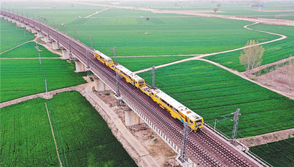 郑州桥工段动力设备车间职工利用大型养路机械车对郑焦城际铁路黄河大桥进行集中捣固、稳定作业。宛文鹏 摄