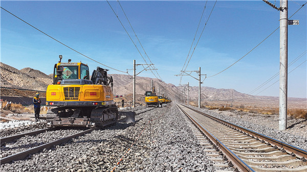 中卫工务段职工在包兰线红卫至干塘区间进行机械换枕施工作业。强 科 摄