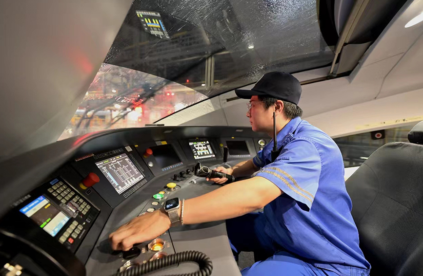 动车组机械师正在进行司机室功能试验,检查动车组雨刮器、车头大灯等部件状态。