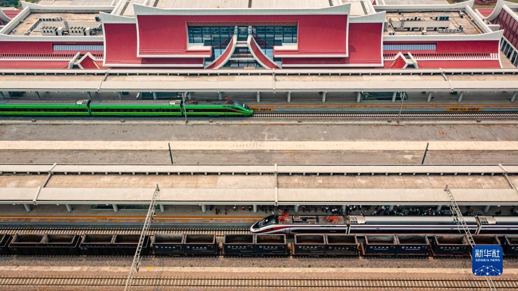 4月13日,“复兴号”(上)、“澜沧号”动车组列车??吭谥欣咸纺ズ┱尽?/p>