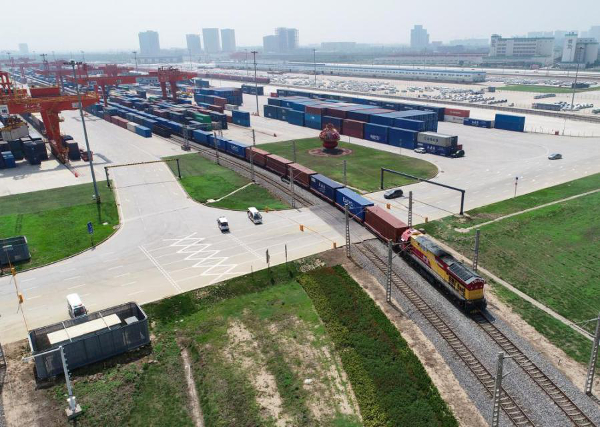 X9015次中欧班列长安号从西安国际港站出发开往哈萨克斯坦。