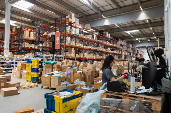 工作人员在西班牙阿尔卡拉的千象盒子物流仓内工作。