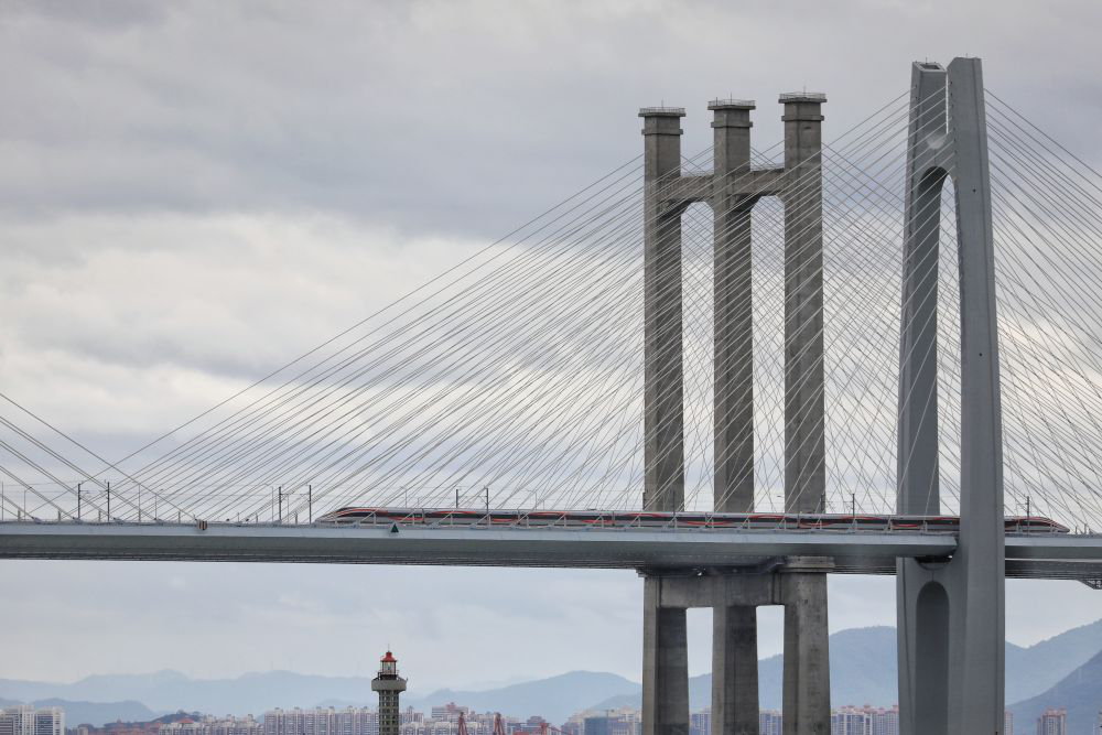 9月4日,“复兴号”智能动车组列车行驶在福厦高铁泉州湾跨海大桥上。