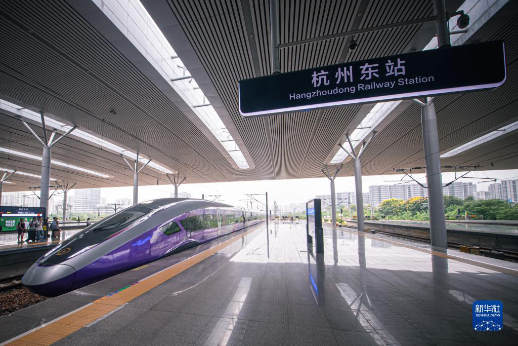 日前,身披杭州亚运会“虹韵紫”涂装的G9313次列车从杭州东站缓缓开出,标志着复兴号亚运智能动车组列车(以下简称“亚运列车”)正式载客运营。亚运会期间,亚运列车将承担部分办赛城市间的相关人员抵离、赛时通勤、赛事转场等功能,为运动员、工作人员、观众等出行提供运力保障。