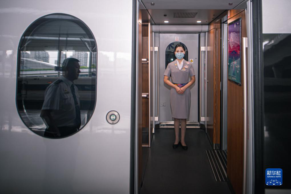 乘务员在复兴号亚运智能动车组列车上准备迎接乘客。