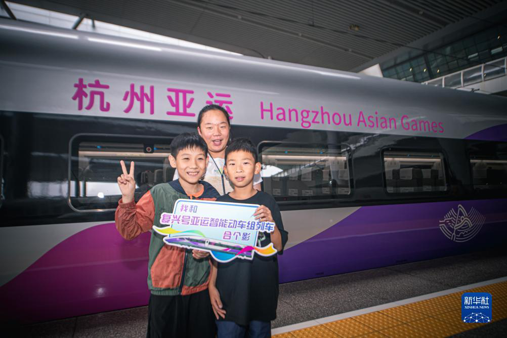 杭州东站站台,小乘客们与复兴号亚运智能动车组列车合影留念。