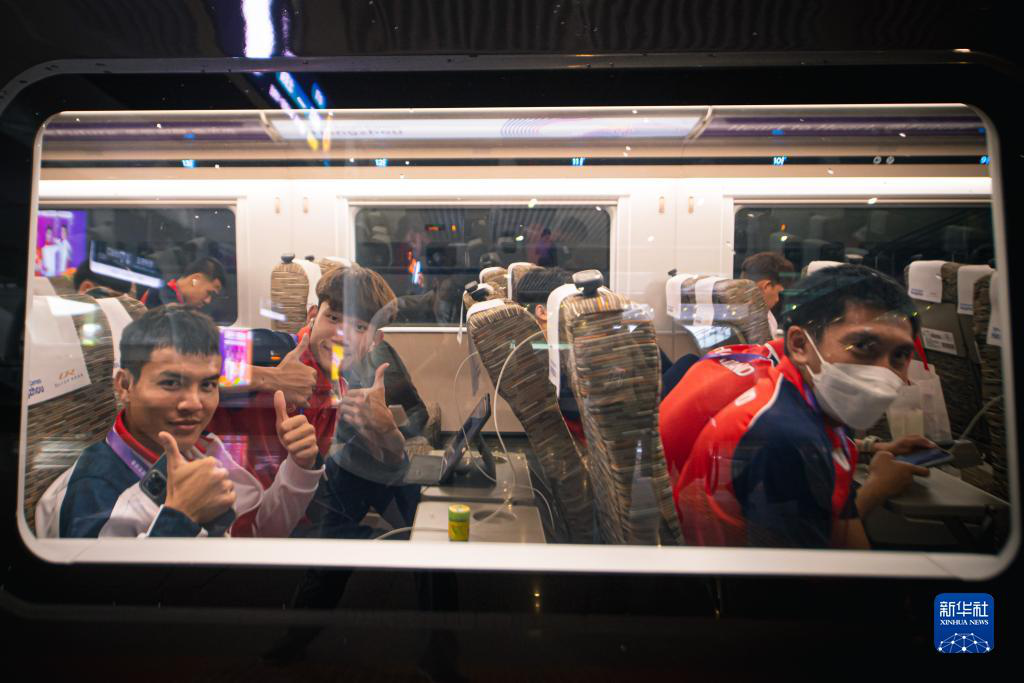 泰国体育代表团成员乘坐复兴号亚运智能动车组列车前往金华赛区。