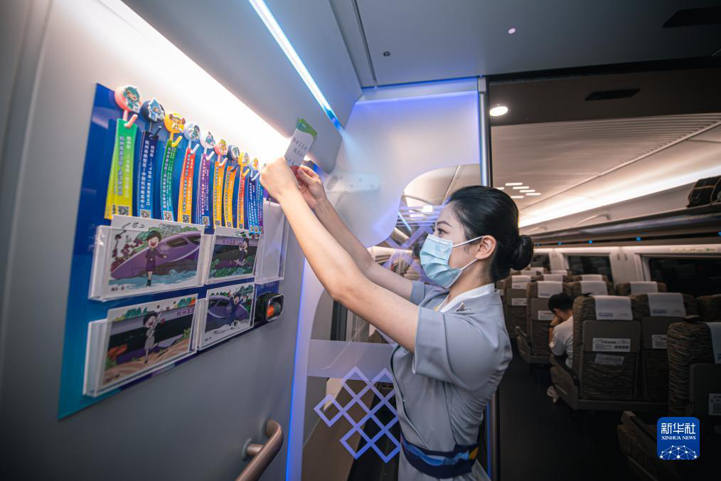 | 复兴号亚运智能动车组列车上设立了亚运文创角,为乘客免费提供明信片等文创纪念品。图为乘务员为亚运文创角补充产品。 |