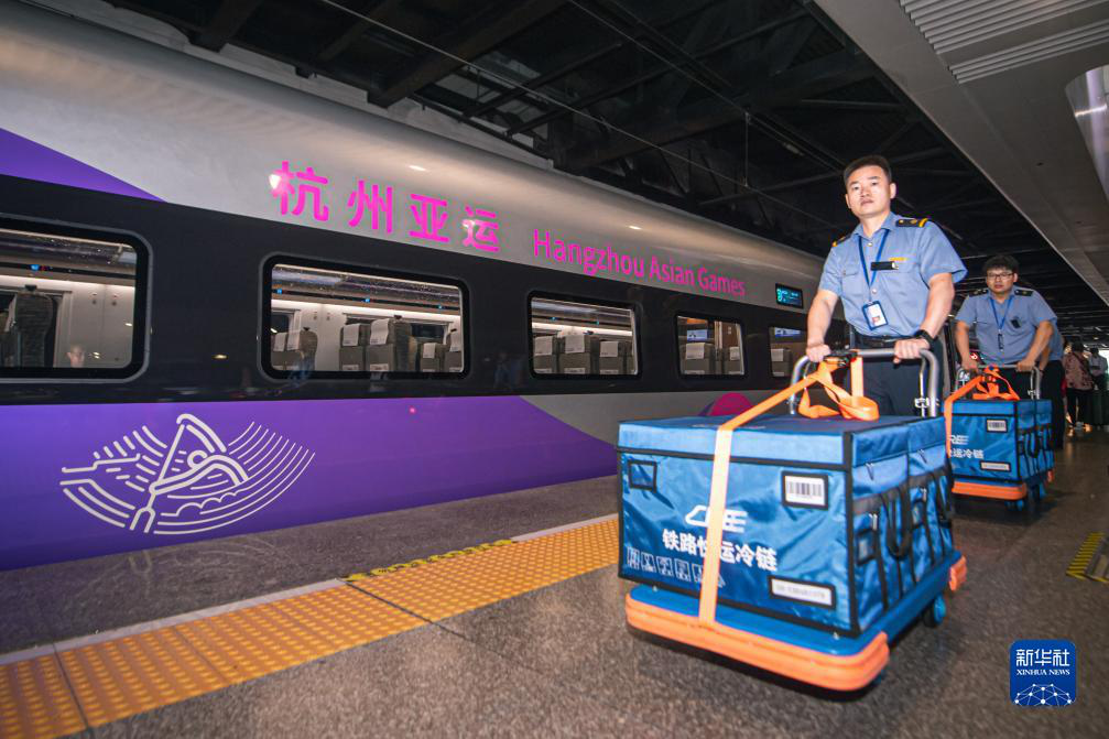 | 中铁快运工作人员准备将冷链运输的杭州亚运会兴奋剂检查样本运上复兴号亚运智能动车组列车。 |