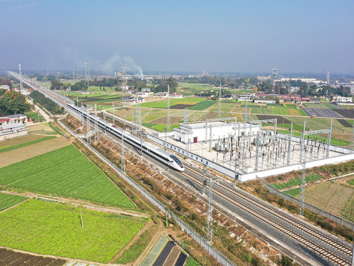 11月28日,成都市青白江区境内行驶在川青铁路上的列车(上)与行驶在宝成铁路线上的列车(下)交会。