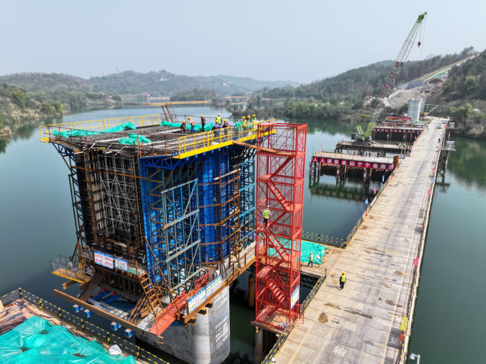 图为位于重庆市铜梁区的成渝中线高铁玄天湖大桥建设现场,工作人员在施工作业。