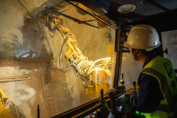 图为位于重庆市大足区的成渝中线高铁刘三寨隧道建设现场,工作人员在操作工程机械进行施工作业。