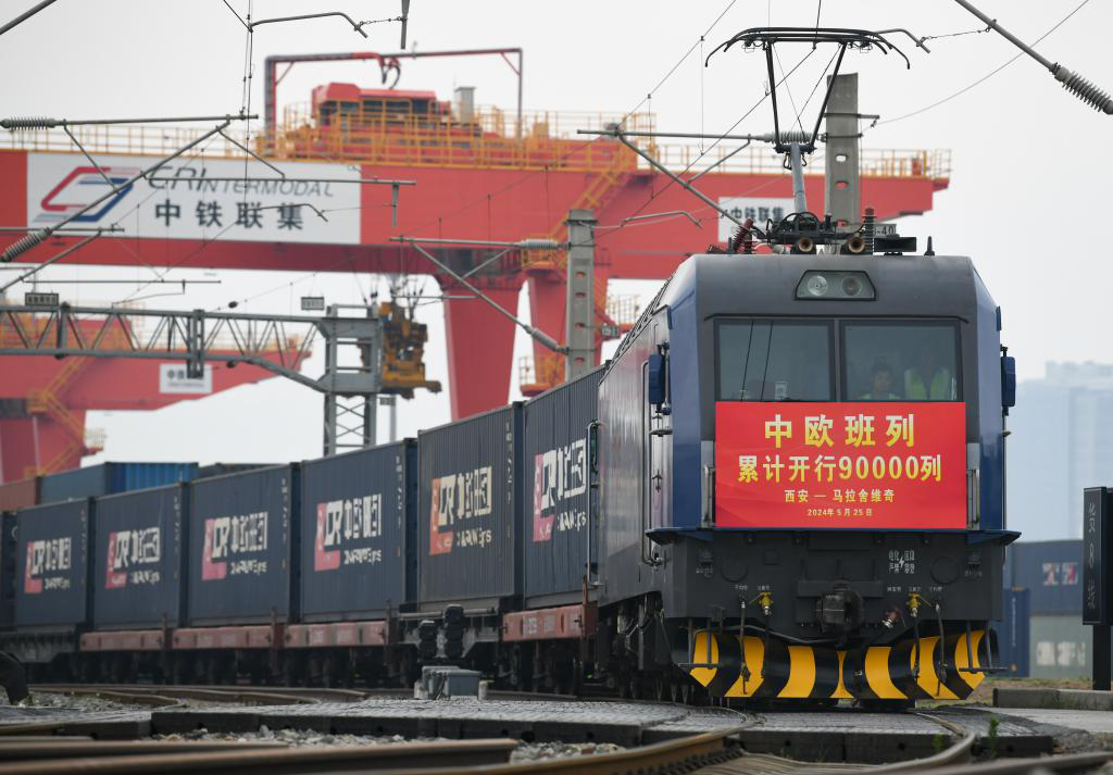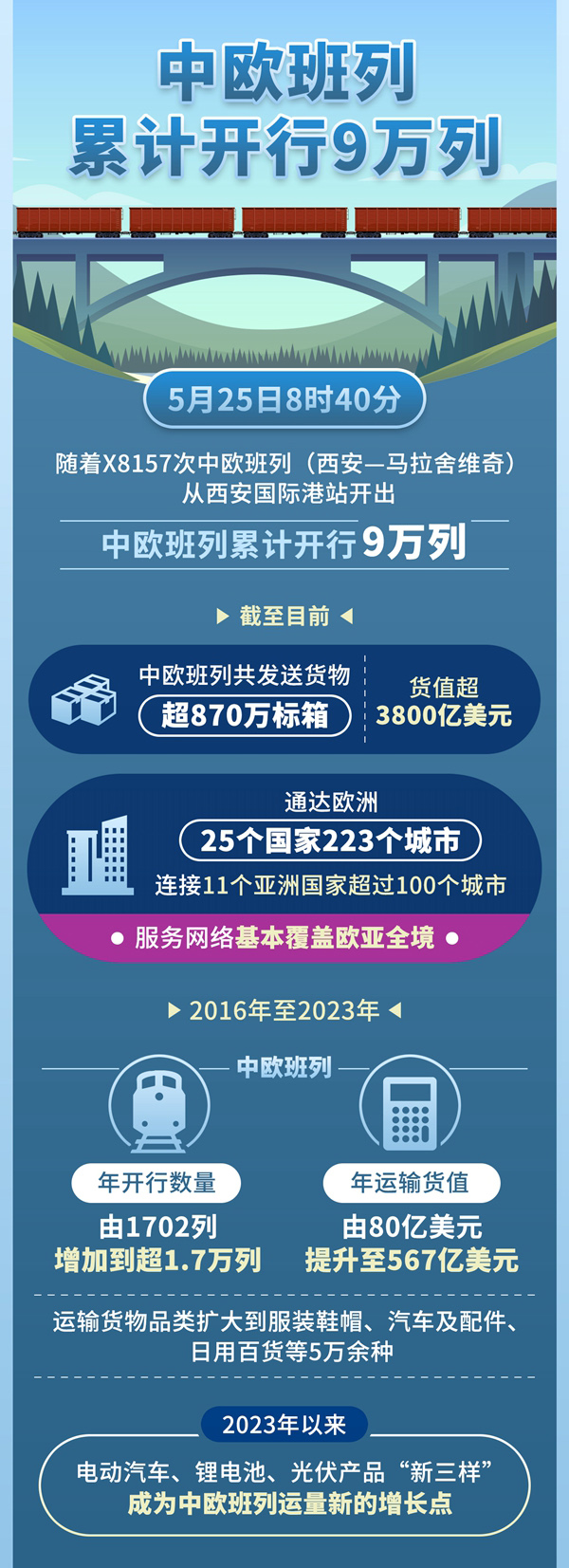 5月25日8时40分,随着X8157次中欧班列(西安—马拉舍维奇)从西安国际港站开出,中欧班列累计开行9万列。截至目前,中欧班列共发送货物超870万标箱、货值超3800亿美元,通达欧洲25个国家223个城市,连接11个亚洲国家超过100个城市,服务网络基本覆盖欧亚全境。