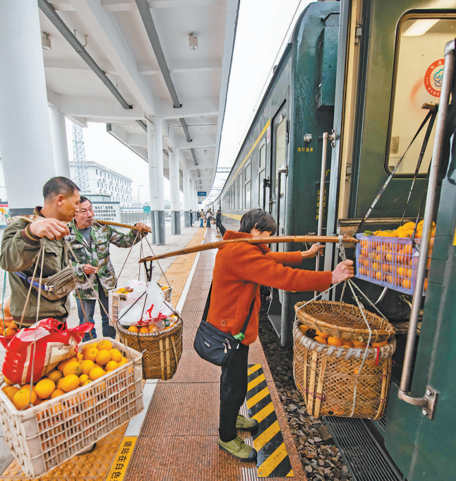 从湖南省怀化市开往重庆市秀山土家族苗族自治县梅江的7272次慢火车??吭诤鲜÷檠裘缱遄灾蜗亟鹾驼?,村民挑着当地特产冰糖柑登上列车,运往贵州省铜仁市销售。